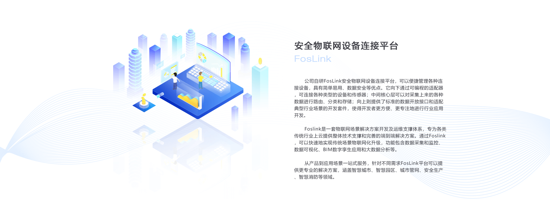 Foslink是一套物聯(lián)網(wǎng)場(chǎng)景解決方案開發(fā)及運(yùn)維支撐體系,專為各類傳統(tǒng)行業(yè)上云提供整體技術(shù)支撐和完善的端到端解決方案。通過(guò)Foslink,可以快速地實(shí)現(xiàn)傳統(tǒng)場(chǎng)景物聯(lián)網(wǎng)化升級(jí),功能包含數(shù)據(jù)采集和監(jiān)控、數(shù)據(jù)可視化、BIM數(shù)字孿生應(yīng)用和大數(shù)據(jù)分析等。